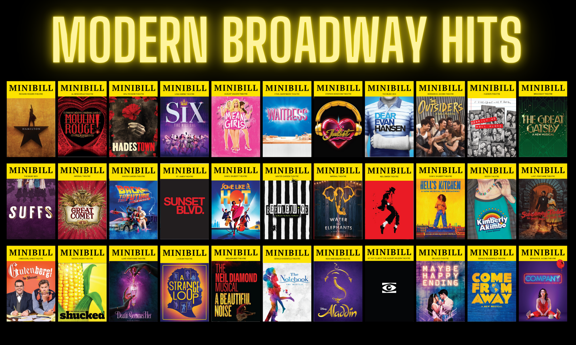 Choose from a Best of Broadway mix or a Modern Broadway mix for $60. The specific Minibills included in each can be seen in the photos below.
